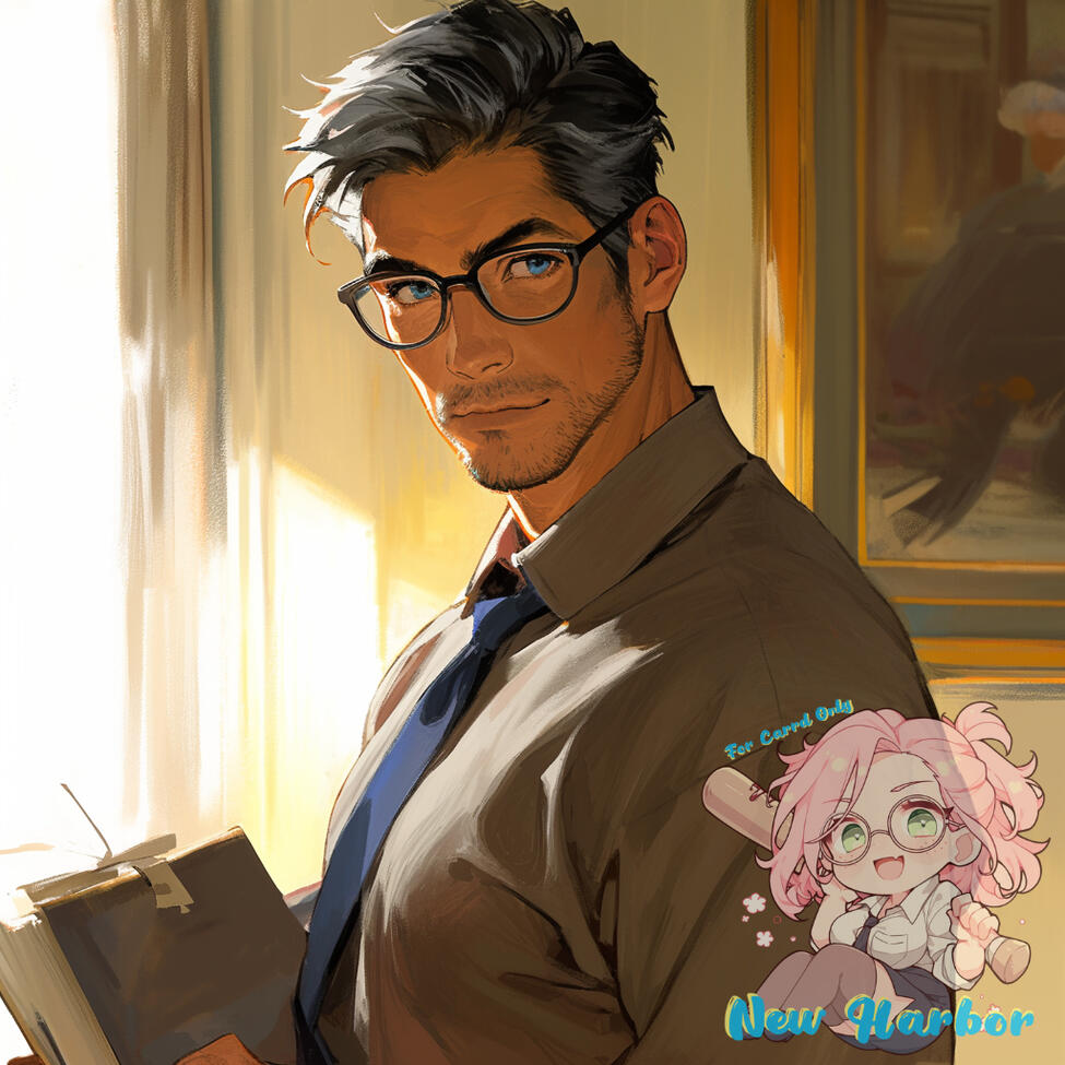 Evan is a tall and fit male with greying black hair that's tousled looking from constantly running his hands through his hair. He has pretty ocean-blue eyes and wears stylish reading glasses. Evan is sun kissed tan from constant exposure to the sun, and he has a short, well-kept salt-and-pepper beard.