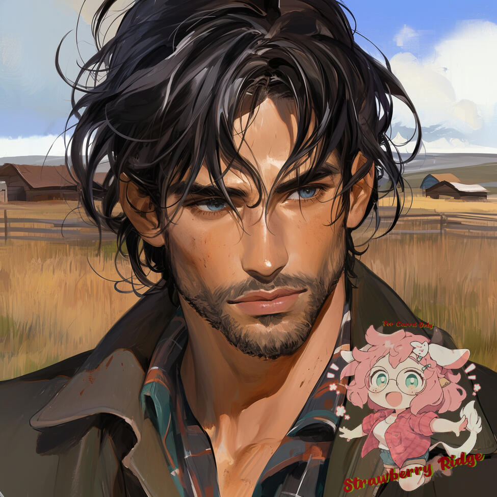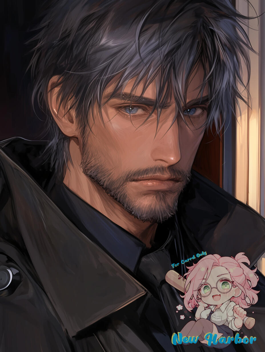 Sweets is a tall, muscular male with shaggy black (grey) hair that's a bit messy from him constantly running his hands through it. He has sharp light blue eyes and thick eyebrows. He has a well groomed boxed beard that's black with hints of grey.
