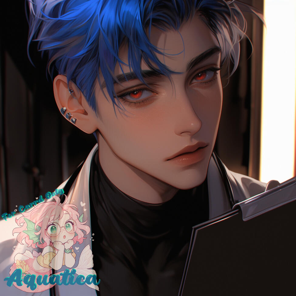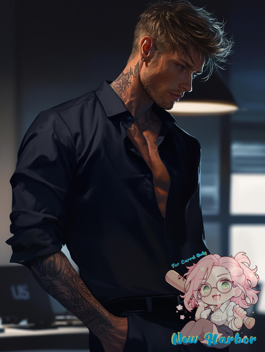 Rino is a tall, lean male with a toned physique. Natural blonde hair that's tousled with an undercut and intense blue colored eyes, he has a well-defined jawline with slight stubble. Rino has a scar . He has tattoos going up his arms, neck, and upper right chest. Rino wears dark colored button ups with the top buttons undone to show off a little, dark dress pants, with polish expensive italian leather black shoes